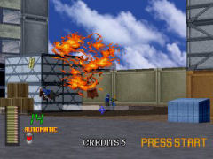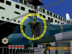 ![]() Granaten werden im Idealfall noch in der Luft zum explodieren gebracht. Wieder heißt es gegen die Verbrecher von Virtua City vorzugehen. Das tut man entweder alleine oder mit einem Kumpel. Auf eurem Streifzug durch die Straßen der Stadt steht ihr vor 3 wählbaren Einsätzen. In der ersten Mission habt ihr die Aufgabe den Überfall auf einen Juwelier zu vereiteln. Hier müsst ihr eine rasante Verfolgungsjagd durchstehen, am Ende wartet ein recht einfacher Endgegner. Die anderen Abschnitte wechseln nur das Gebiet und Endgegner, so wie den Schwierigkeitsgrad. Der "Medium" (also mittelschwere Einsatz) führt euch auf ein Schiff, auf dem ihr den Bürgermeister der Stadt befreien müsst. ![]() Die drei Missionen bieten euch verschiedene Schwierigkeitsgrade. Alle Level sind abwechslungsreich gestaltet, neu im Gegensatz zum Vorgänger ist die freie Wahl des Weges an manchen Stellen im Spiel. Dort könnt ihr eine von zwei Routen aussuchen. Diese Abzweigungen sind zwar selten, aber motivieren zum vermehrten Spielen. Gespielt wird ansonsten wieder wie bei Teil 1: Nachladen durch wegzielen vom Bildschirm, eure Waffe fasst 6 Kugeln und ab und zu kann man Extrawaffen finden. Das kann eine Automatik (15 Schuss Magazin), Magnum, MP oder ein automatisches Gewehr sein. Manche davon können nachgeladen werden, anderen wiederum nicht. Die Gegner könnt ihr an den unterschiedlichsten Stellen treffen. ![]() Jetzt aber schnell: Wird der Indikator rot, drückt der Gegner ab. Solltet ihr Schwierigkeiten haben mit dem Spiel könnt ihr in den Optionen jede Menge Einstellungen vornehmen. Egal ob Continues, Leben oder die üblichen LightGun Anpassungen - hier findet ihr jede Menge Tuning-Möglichkeiten. Auch ein zusätzlicher Schwierigkeitsgrad darf bestimmt werden. Insgesamt ist das Spiel aber sehr ausgewogen und bietet für jeden Anspruch die richtige Herausforderung. Wie bereits erwähnt könnt ihr auch zu zweit auf Streife gehen. ![]() Zu spät! Dieser Schuss hat getroffen! Sound und Musik entsprechen dem Vorgänger und sind nicht weiter erwähnenswert. Grundlegend aber wieder ein solider Titel, der einfach Spaß macht, egal ob allein oder zu zweit. Wer den Vorgänger mochte kann hier nix falsch machen. Und wer auf gute Lightgun-Action steht muss sowieso zugreifen. Da es aber mittlerweile auch die verbesserte Elite Edition für die PS2 gibt, ist diese eindeutig die bessere Wahl! Erstens weil sie einfach besser aussieht und zweitens weil sie sich durch die G-Con2 oder diverse anderen Knarren wesentlich besser spielt! Die Version des Spiels für den Dreamcast ist nichts weiter als ein warmer Aufguss der Saturn Version. Muss nicht sein!