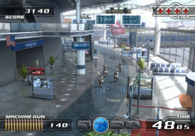 ![]() Die erste Szene im Spiel! Es kann also los gehen! An vorderster Spitze treten zwei neue Agenten an (der eine ähnelt Orlando Bloom sehr stark), die aber wie eh und je gestrickt sind. Wie bereits in Teil 3 kennen gelernt, stehen euch vier Waffentypen zur Auswahl (Pistole, MG, Shotgun und Granatwerfer), die ihr euch in der Deckung auswählen könnt. Das "Duck&Reload"-Prinzip wurde beibehalten (leider ist das Pedal am Automaten wieder Mangelware) und auch sonst sind keine beachtlichen Neuerungen zu sehen. Grafisch reiht sich das Game nämlich gerade mal leicht vor Time Crisis 3 ein und nur die in speziellen Situationen zur Verfügung stehenden schwereren Waffen (zB. ein Scharfschützengewehr oder eine größere MG) bieten etwas Neues. ![]() In solch einer Situation dürfen auch mal schwerere Geschütze aufgefahren werden. Die Gegner sind wieder Klasse animiert und zum ersten Mal dürfen auch andere Feinde, nämlich Ungeziefer, dran glauben. Ungeziefer? Allerdings! Leuchtet mir auch nicht ein und es spielt sich wie ein Minispiel. Tausende von Krabblern müssen möglichst schnell von der Bildfläche verschwinden, was zwar nicht unbedingt nervig, aber unpassend ist. Dabei helfen euch die besonderen Tipps eures dritten Kameraden, den ihr gleich zu Beginn des Spiels trefft, weiter, der euch dann zum jeweiligen Waffentyp rät. Dieser kann ganz schon nerven. Wieder macht Namcos neuster Titel aus der Lightgunreihe alles gut, allerdings nichts besser. Trotzdem lohnenswert und spaßig und deshalb sein Geld wert.