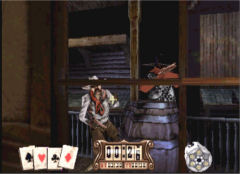 ![]() Waren die Cowboys damals wirklich so kantig? Der Spieler schlüpft in die Rolle von Jesse James, der seine Freundin aus den Klauen eines üblen Gangsterbosses befreien muss. Auf seinem Weg zum Showdown schießt man sich durch einen Saloon, eine alte Ruine, eine Mine, einen Zug und schließlich die Banditen verseuchte Stadt des Obergangsters. Dabei laufen einem meistens nur Bösewichte vor den Revolver, nur selten tauchen Zivilisten auf die man verschonen muss! Diese sind aber manchmal schwer zu identifizieren und werden daher beim ersten Mal spielen höchstwahrscheinlich niedergestreckt. Beim zweiten Mal spielen, weiß man dann aber wo und wann ein Zivilist auftaucht. Ebenso verhält es sich mit den Feinden. Gespielt wird wie bei Time Crisis: Die Spielfigur verschanzt sich immer hinter Gegenständen und man kann zum feuern die Deckung verlassen. Ob man dafür eine Taste drücken oder loslassen muss ist Einstellungssache. Die Levels sind kurz und die Endbosse sind keine wirkliche Herausforderung. Dass der Schwierigkeitsgrad dabei nicht gewählt werden kann, macht die Sache noch schlimmer. ![]() Treffer! Wenn euch der Feind erwischt, kommt das deutlich zur Geltung. Wirklich gut hingegen ist die Musik gelungen. Die Stücke hören sich gut an und geben gut die Atmosphäre der jeweiligen Location wieder. Wobei der Sound hingegen wieder nicht durch Klasse besticht. Hier wird einfache Kost geboten. Bleibt noch die Grafik: Wie auch beim ersten Time Crisis wirken die Gegner kantig. Hinzu kommt das sie sich recht hektisch bewegen. Der Rest ist Durchschnitt. Was jedoch sehr störend auffällt ist das Fehlen eines Mehrspielermodus! Warum wurde nicht ein Duell eingebaut oder ein kooperativer Modus wie in Time Crisis 2? Eigentlich schade, dass hier nicht mehr daraus gemacht wurde. Wilder Westen und Lightguns passen eigentlich zusammen wie die Faust aufs Auge. Leider wurde hieraus eher nur ein Schlag ins Gesicht! Es gibt aber mittlerweile einen Nachfolger für SONYs PS2. Dessen Qualitäten lest ihr in einem anderen Test!